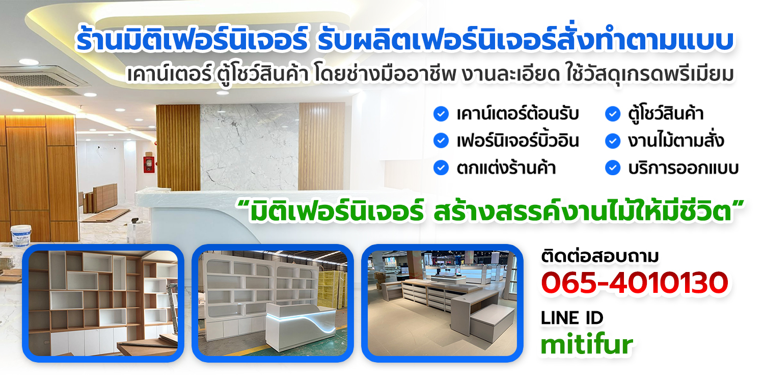 ร้านมิติเฟอร์นิเจอร์ รับผลิตเฟอร์นิเจอร์สั่งทำตามแบบ เคาน์เตอร์ ตู้โชว์สินค้า โดยช่างมืออาชีพ งานละเอียด ใช้วัสดุเกรดพรีเมียม ตอบโจทย์ทุกดีไซน์เพื่อธุรกิจและบ้านของคุณ ปรึกษาฟรี